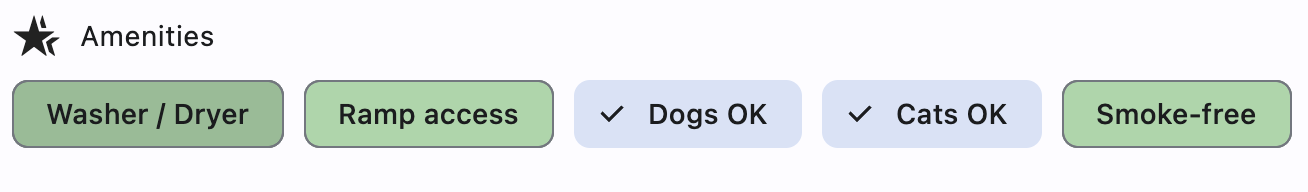 amenities = ["Washer / Dryer", "Ramp access", "Dogs OK", "Cats OK", "Smoke-free"]